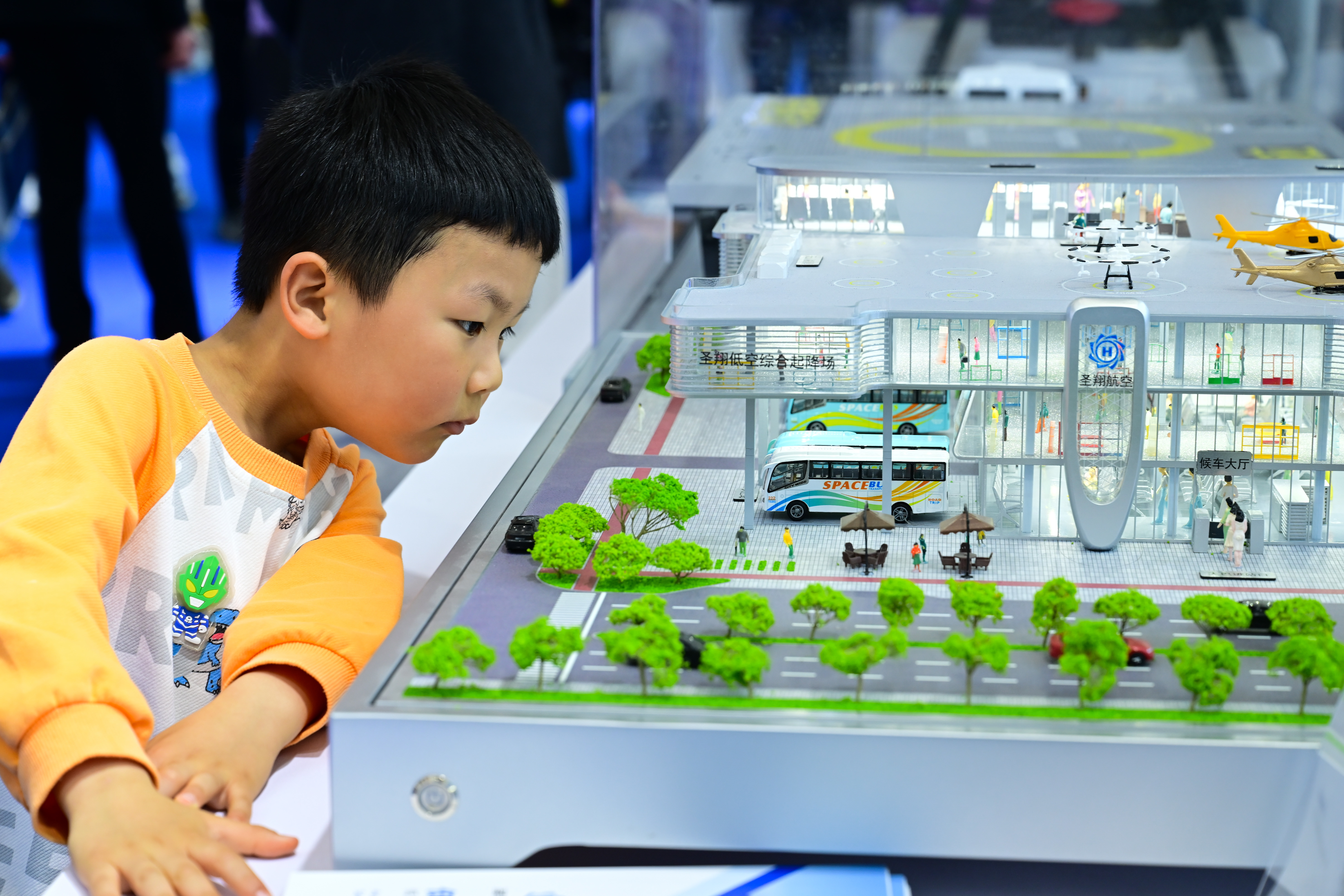4月26日,小朋友在第四届中国(安徽)科技创新成果转化交易会上观看一款低空枢纽起降场模型。