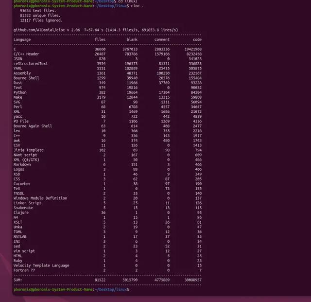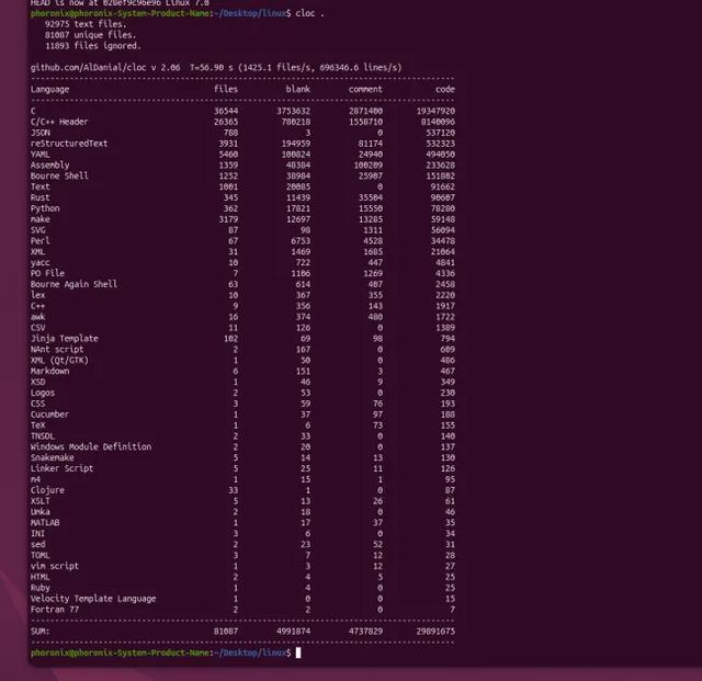 根据cloc程序的统计,Linux v7.0的Git仓库总计为39621378行,其中包含4991874空白行、4737829行注释,以及29891675行被识别为实际代码的内容。 而截至4月26日早间,Linux 7.1 Git源码树已增至39880636行,这意味着即便经历了多项删除工作,本轮合并窗口内仍净增约25.9万行代码。 在这一总量中,包括5015790行空白行、4775889行注释,以及30088957行实际代码。