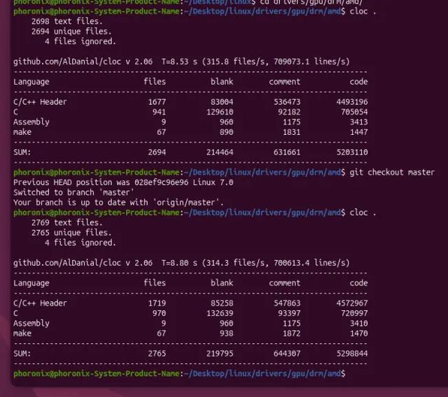 除内核整体体量外,Linux内核中AMD图形驱动相关目录drivers/gpu/drm/amd的规模也相当庞大,其中涵盖AMDGPU、AMDKFD、显示核心代码以及针对各代GPU自动生成的头文件等内容。 统计结果显示,在Linux 7.0阶段,这一现代AMD内核图形驱动栈的代码总量为6049235行,而在当前Linux 7.1 Git状态下,这一数字已上升至6162946行,进一步凸显出GPU驱动子系统在Linux源码树中所占比重持续提升。