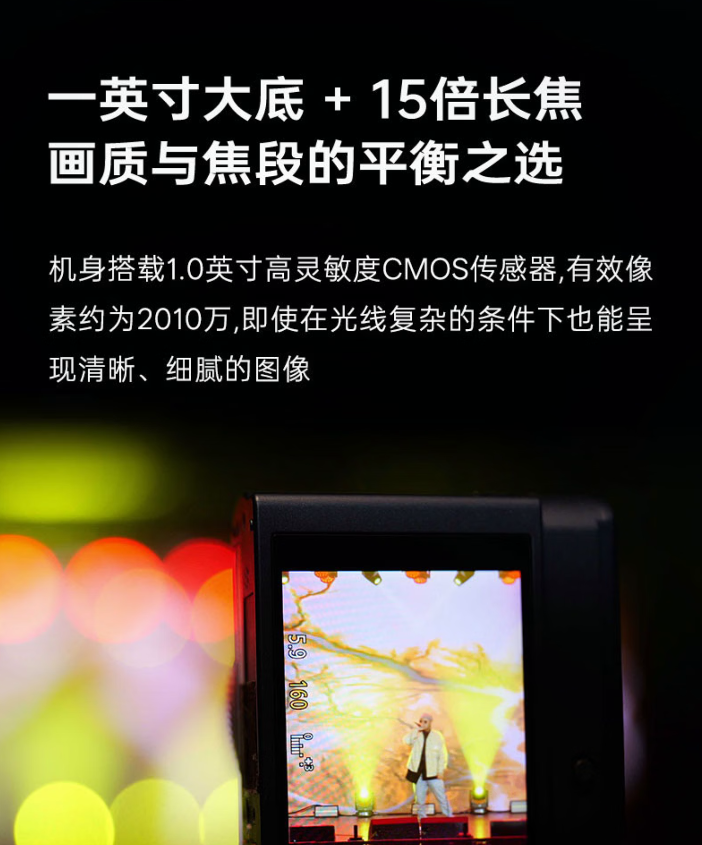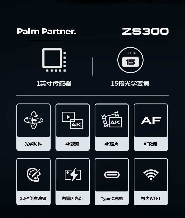 松下 LUMIX ZS300 相机搭载 1 英寸 CMOS 传感器,有效像素约 2010 万;搭载徕卡认证 15 倍光学变焦(等效 24-360mm),最近对焦距离可达 3 厘米,支持 5 轴混合防抖技术。