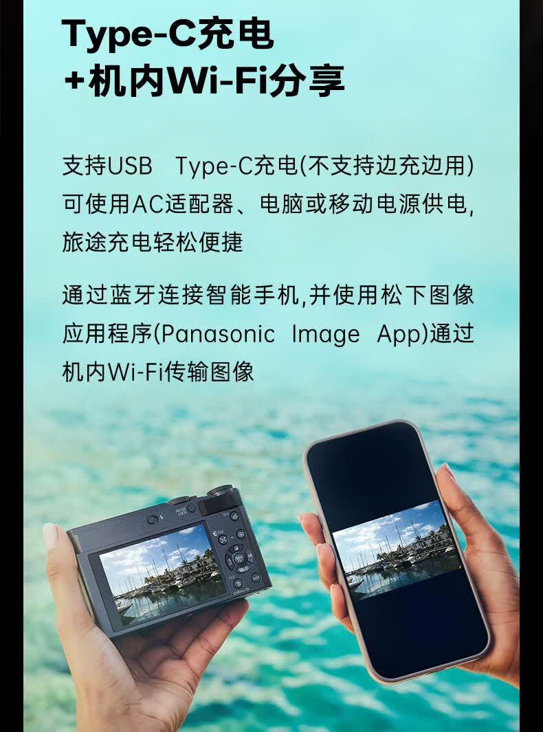 松下 LUMIX ZS300 相机有黑色与银色两种颜色可选,内置闪光灯和 22 种创意滤镜;支持 Type-C 充电,可通过蓝牙连接智能手机,并通过机内 Wi-Fi 传输图像。